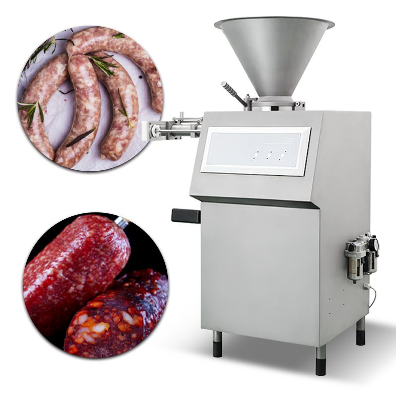 This automatic filling and linking machine is pneumatically powered, made of stainless steel, easy to clean and simple to operate, and the hot dog can be adjusted between 50-1000g.
